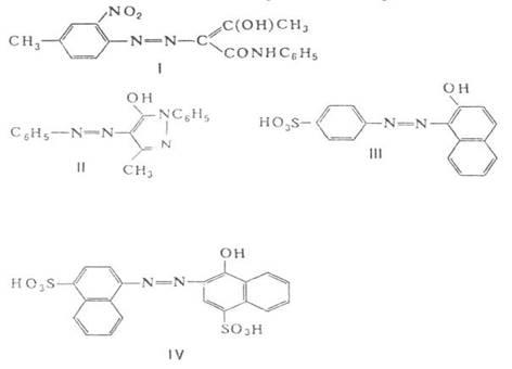 1. Пигменты (азопигменты) - главным образом. Моноазокрасители и дисазокрасители. (например, I); не содержат кислотных (SO3