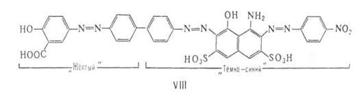 , CONH и т.п. или отсутствует (поворот Аr' и Аr" делает молекулу неплоской). Части молекулы, разделенные фрагментом X, поглощают свет независимо друг от друга. Цвет таких красителей приблизительно соответствует цвету смеси азокрасителей, которые могли бы образоваться при разрыве молекулы по X. Например, полиазокраситель VIII окрашен в зелёный цвет, соответствующий смеси составляющих его жёлтого моноазокрасителя и тёмно-синего дисазокрасителя.