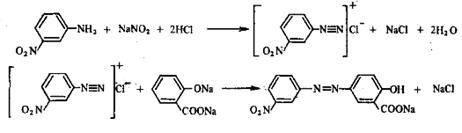 -нитроанилина в разбавленной соляной кислоте (8,5 мл концентрированной НС1 в 40 мл воды). Для полного растворения содержимое слегка нагревали. Охладив полученную смесь до 0°С, ее диазотировали, добавляя по каплям из капельной воронки раствор 1,5 г нитрита натрия в 5 мл воды. Следили за тем, чтобы температура не поднималась выше 5°С. Диазораствор при хорошем размешивании приливали к находящемуся в фарфоровом стакане при 0°С раствору 2,5 г салициловой кислоты и 7,5 г карбоната натрия в 40 мл воды. Жёлтый осадок красителя отфильтровали, слегка промыли 10%-ным раствором хлорида натрия и сушили при 40-50°С.