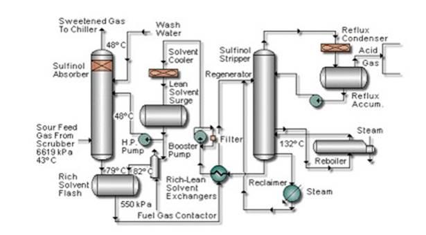 В процессах физико-химической абсорбции используют комбинированные абсорбенты- смечь физического абсорбента с химическим. Для этих абсорбентов характерны промежуточные значения растворимости кислых компонентов газа. Эти абсорбенты позволяют достигать тонкой очистки газа не только от сероводорода и диоксида углерода, но и от сероорганических соединений. Наибольшее промышленное применение нашел абсорбент «Сульфинол», представляющий собой смесь диизопропаноламина (30-45%), сульфолана (диоксида тетрагидротиофена 40-60%) и воды (5-15%). Также в последнее время стал широко внедряться абсорбент «Укарсол» (отечественный аналог «Экосорб»). Этот абсорбент позволяет проводить селективную очистку газа от сероводорода в присутствии СО2 при одновременной очистке газа от сероорганических соединений.