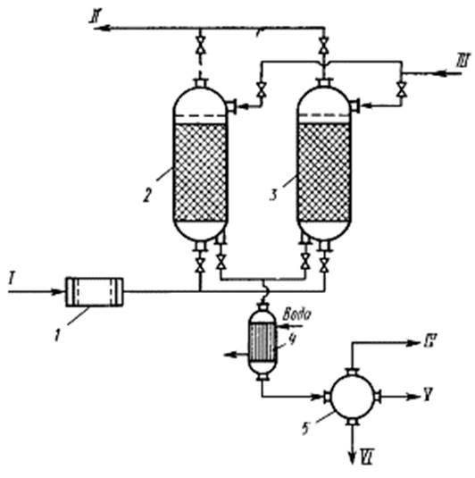 1 — фильтр; 2, 3 — адсорберы; 4 — конденсатор; 5 — сепаратор; І — очищаемый газ; ІІ — очищенный газ; ІІІ — водяной пар; IV — неконденсируе.уые пары; V — сконденсированный адсорбтив в хранилище; VI — водный конденсат