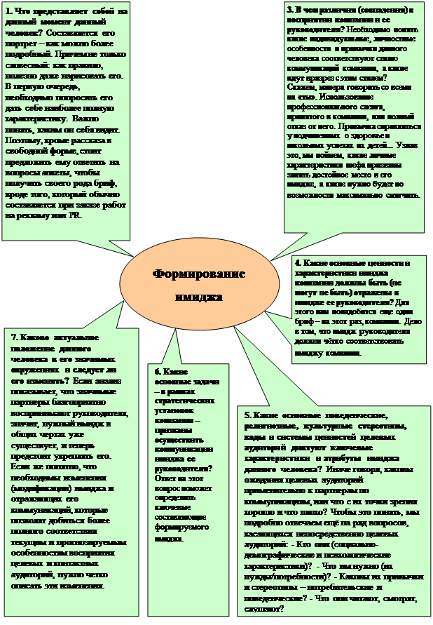 Существует ряд вопросов (второй вариант [5] последовательности выстраивания собственного имиджа), на которые желательно ответить, принимая решения о формировании, укреплении, продвижении и видоизменении имиджа руководителя (см. рис.2.2.). Их семь, и, опираясь на собранную с их помощью информацию, можно выстроить такой имидж, который будет и благоприятным в глазах целевой аудитории, и комфортным для его носителя.