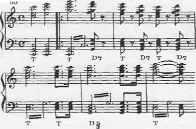 Применение разных обращений трезвучий и септаккордов кроме всего прочего помогает композитору достичь плавного ведения голосов. Если ми обратимся к теме финала Пятой симфонии Бетховена (пример 50), то увидим, что и мажорное трезвучие и малый мажорный септаккорд применяются здесь в основном виде, без обращений. Бас при этом движется большими скачками, что тоже способствует созданию решительного, мужественного характера теми. Напротив, плавное ведение баса обычно связано с применением обращений аккордов и почти всегда — с более мягким характером звучания (см. движение баса в примерах 74 о и 193).