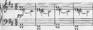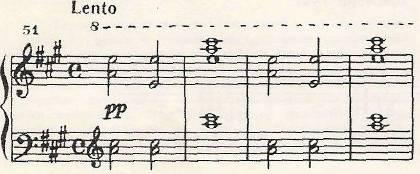 Однако при всех нюансах восприятия диссонансов их значение и смысл в классической музыке не меняется; не меняется и закономерность движения от диссонанса к консонансу. Лишь в нашем столетии диссонанс становится более автономним — не только не требует разрешения, но и подчас вьшолняет роль тех устойчивых опор в музыке, которые ранее выполняли только консонансы. В определенных условиях мы воспринимаем некоторые диссонирующие сочетания как самостоятельные, не обязательно вызывающие за собой появление консонанса. Например, тогда, когда усложняется добавочными (так называемыми неаккордовыми) звуками основное трезвучие, с которого обычно начинается произведение. Например, в пьесе Дебюсси «Кукольный кэк-уок»[1]