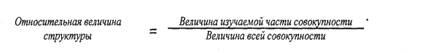 Относительные величины структуры характеризуют состав изучаемых совокупностей. Исчисляются они как отношение абсолютной величины каждого из элементов совокупности к абсолютной величине всей совокупности, т.е. как отношение части к целому, и представляют собой удельный вес части в целом. Как правило, относительные величины структуры выражаются в процентах (база сравнения принимается за 100). Показатели структуры могут быть выражены также в долях (база сравнения принимается за 1).
