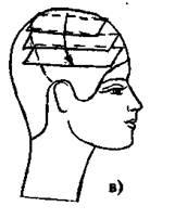 3. Приемом «наложение пряди на прядь» стрижем одновременно височные зоны и верхнюю затылочную, отделяя пряди на височных зонах горизонтальными проборами, а на верхней затылочной – косыми, которые сходятся треугольником в середине затылка. Каждую последующую прядь стрижем на уровне предыдущей с внутренней стороны пальцев под углом 45–90 градусов, в направлении от виска к середине затылка (рис б).