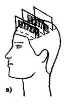 3. Так попрядно вертикальными проборами отчесываем волосы теменной зоны на виски и стрижем их на уровне предыдущих прядей с внешней градуировкой, угол оттяжки 45–90 градусов. Таким образом, продвигаемся одновременно с двух сторон к середине теменной зоны (рис в).