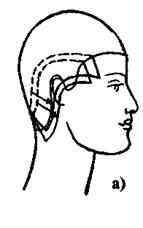 2. Одновременно на височных зонах от линии роста волос над ухом и за ухом также выполняем «сведение на нет» до верхнего овального контура. Окантовка на виске прямая удлиненная (рис а).