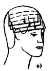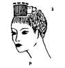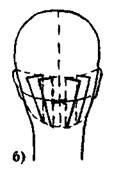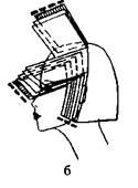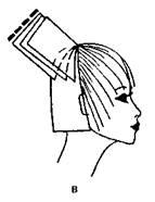 1. Одним захватом отчесываем волосы височных и верхней затылочной зон, захватываем их с внутренней стороны пальцев и стрижем на уровне нижних коротких волос по овальному контуру в направлении от виска к середине затылка, сначала с одной стороны, потом с другой. Таким образом намечаем верхний контур овальной «шапочки». Если волосы густые, то выполняем стрижку по контуру в два захвата (рис б).