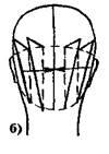 Отделить сбоку прядь шириной 2–3 см. Определить длину базовой пряди, которая забирается на макушке. Следующие пряди, оттягивая вперед, подстригают по базовой линии. Исходя из этой линии, стригут волосы боковых зон, забирая их веерообразно, пряди держат вертикально и стригут под углом, как показано на рисунке б.
