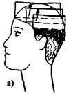 2. Далее, ориентируясь на длину КП, приемом «прядь за прядью» вертикальными проборами стрижем всю височную зону с уменьшением длины волос к уху (рис а).