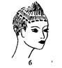 Отделяем прядь вдоль всего горизонтального пробора и стрижем по заданной длине, образуя линию каре. Последующие пряди стрижем методом наложения прядей с небольшим удлинением для естественного подгибания волос вовнутрь. Волосы над лицом стригут в виде бахромы, сильно прореживая (рис. б).