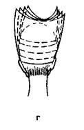 Выбираем на середине затылочной зоны вертикальную прядь и срезаем, укорачивая вниз до 2 см. Эта прядь будет контрольной. Отделяем по всему контуру вертикальные пряди и стрижем, ориентируясь сначала на контрольную, затем на предыдущую пряди, от середины к ушам (рис. г).