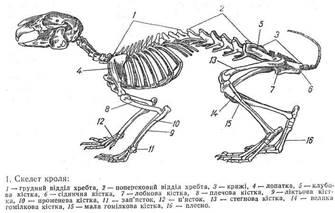 Анатомічні особливості. Кістяк кролів складається з осьового кістяка, який у свою чергу складається з хребетного стовпа і черепа, та кістяка кінцівок (грудних і тазових), в якому розрізняється кістяк вільних кінцівок та пов'язаних із тулубом грудного і тазового поясів (рис. 1). Він виконує опорну, захисну та ряд інших функцій.