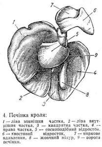 Печінка у кроля велика, що при звуженій черевній порожнині створює враження досить об'ємного органа, вага її дорівнює 80—120 г, що становить 4— 4,5 % ваги тіла. Це лопатевий паренхіматозний орган буро-червоного кольору (рис. 4).