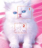 A - тиражного флексографского оттиска; B - растрированной цветопробы и C - полутоновой. Мелкие детали, видимые на полутоновой цветопробе (например, усики котенка) теряются при растрировании
