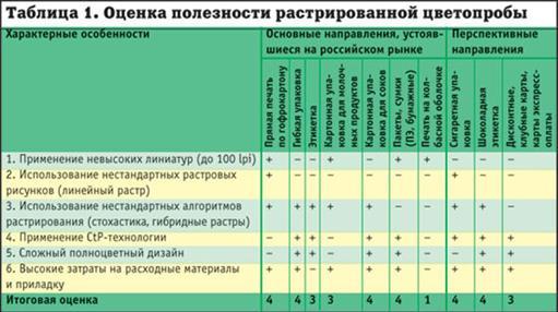 Для решения таких задач растрированная цветопроба просто незаменима и позволит существенно облегчить операции контроля. Попытаемся оценить ее полезность для производителей упаковки и этикетки. Рассмотрим табл. 1.