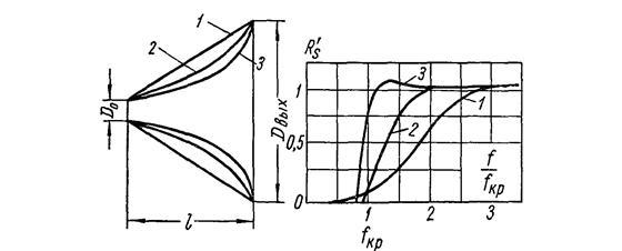 Приведенная зависимость показывает, что рупор начинает эффективно излучать с некоторой частоты, называемой критической частотой рупора . Экспоненциальные рупоры обладают лучшими характеристиками по сравнению с рупорами другой формы и применяются чаще других. Для экспоненциального рупора: