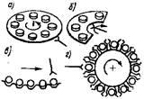 состоит из корпуса, внутри которого на звездочках натянута замкнутая цепь с консольно укрепленными (через шаг) пальцами, перемещающими детали (кольца, фланцы) по направляющей (рис.10. г). Заготовки подаются в конвейер через механизм приема (с отсекателем), а выдаются через механизмы выдачи. Такой конвейер применяют для распределения катящихся заготовок между параллельно действующими станками.