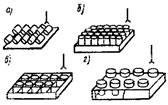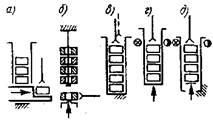 Накопительные устройства могут иметь вид магазинов с вертикально расположенными стопками деталей. Деталь подается роботу поштучно снизу при помощи шиберного устройства (рис.5, а) или вертикально движущегося съемного устройства (рис.5, б). Манипулятор берет деталь и пошагово перемещается сверху вниз (рис.5, в); или же деталь подается манипулятору путем пошаговой подачи самого магазина (рис.5, г) либо стопки деталей внутри магазина (рис.5, д).
