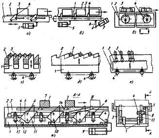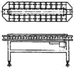 применяют для перемещения заготовок типа вал поперек оси. Конвейер одинарного действия (рис.9, г) состоит из двух неподвижных пилообразных реек, между которыми размещены две подвижные рейки, перемещаемые вверх - вниз от кулачкового (кривошипного) механизма. В результате этого движения подвижные рейки перебрасывают заготовки через вершины неподвижных реек. Для увеличения, производительности в конвейерах двойного действия (рис.9, д) подвижные рейки смещены относительно неподвижных на пол шага. Принцип работы конвейера аналогичен предыдущему. Детали скатываются по наклонной части реек под действием силы тяжести.