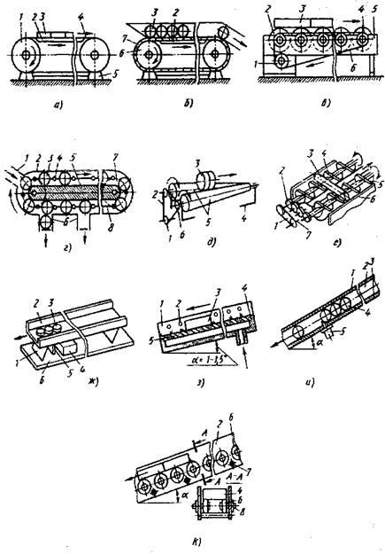 предназначены для гравитационного перемещения заготовок качением по роликам или скольжением по наклонной (в большей части прямой) поверхности длиной 2. .5 м и более (рис.8, и, к). Угол наклона конвейеров устанавливается в зависимости от способа перемещения заготовок, их массы и материала. При перемещении деталей качением = 5.10° (рис.8, и), a при скатывании по роликам = 3. .5° (рис.8, к). Для каждой конкретной заготовки и способа ее перемещения производится подбор угла наклона конвейера с учетом допустимой скорости соударения деталей, при которой на поверхности их (при ударах) не образуются дефекты в виде забоин, вмятин и пр.