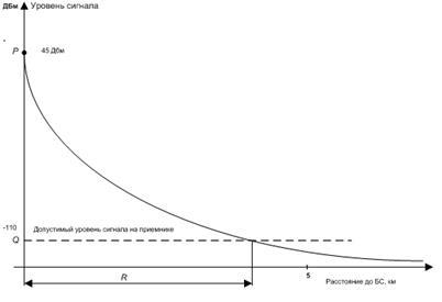 На рисунке выше показан характерный вид функции уровня сигнала в зависимости от расстояния между БС и абонентом. Пересечение этой функции с прямой Q