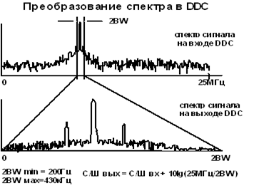 В модуле цифрового приёмника отсчёты с выхода АЦП обрабатываются специализированным сигнальным процессором DDC (Digital Down Converter). Функции этого процессора - преобразование информативного спектра частот в область низких (нулевых) частот, квадратурная фильтрация и децимация отсчётов сигнала. По реализуемым функциям - это цифровой приёмник прямого преобразования. DDC имеет два перемножителя, генератор отсчетов SIN и COS, идентичные каналы НЧ децимирующих фильтров. Частота настройки внутреннего генератора может изменяться в диапазоне от 0 до 25МГц (до половины тактовой частоты DDC). Частота среза фильтров изменяется от сотен Гц до сотен кГц. Процессор производит децимацию отсчётов сигнала для того, чтобы скорость потока данных с выхода DDC была сообразна ширине спектра выходного сигнала.