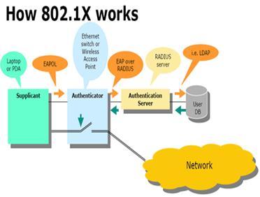 - Autentificator – вузол доступу, аутентифікатор ( безпроводова точка доступу чи провідний комутатор з підтримкою протоколу 802.1х );