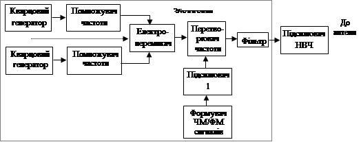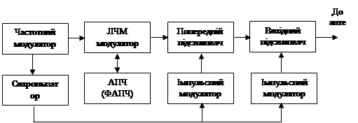 На рис.5. зображена структурна схема багатокаскадного РПП. Збудник передавача формує ФМ або ЧМ сигнал на НВЧ і включає в себе: кварцовий генератор, множник частоти, електронний перемикач, перетворювач частоти та формувальник ЧМ або ФМ сигналу.