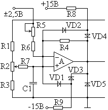 Схема защиты входа АЦП от перегрузок работает следующим образом. Диоды VD1 и VD2, включенные параллельно резистору обратной связи R4, образуют двухсторонний ограничитель. Диод VD4 и стабилитрон VD3, смещенные постоянным током от источников 15 и –15В, задают уровни ограничения в отрицательной и положительной областях (относительно UREF