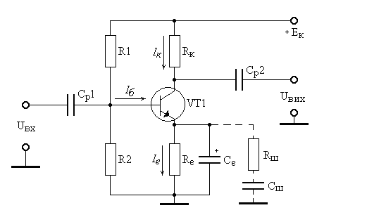 Транзистор ввімкнутий за схемою зі спільним емітером: джерело сигналу, емітер та навантаження каскаду мають спільну точку. Схема містить кола живлення з фіксованою напругою Uбе й емітерну стабілізацію робочої точки, яка ґрунтується на послідовному негативному зворотному зв’язку НЗЗ через резистор Rе. Напруга UR2