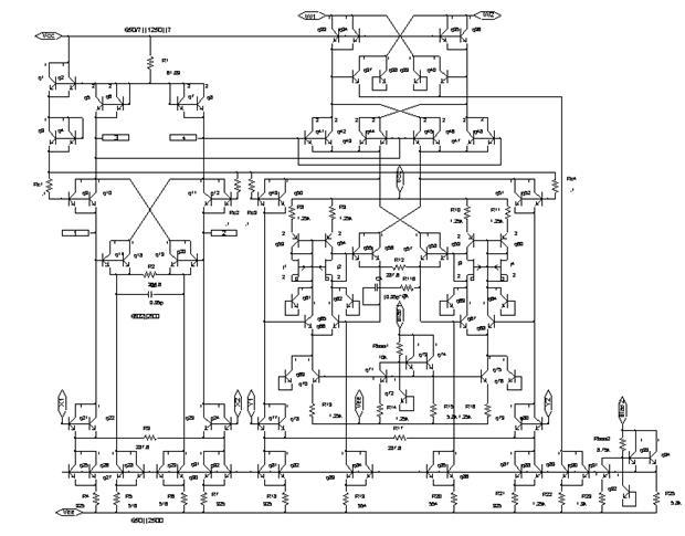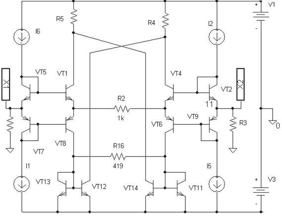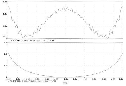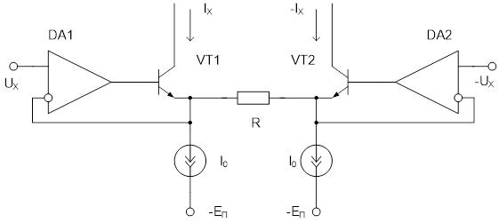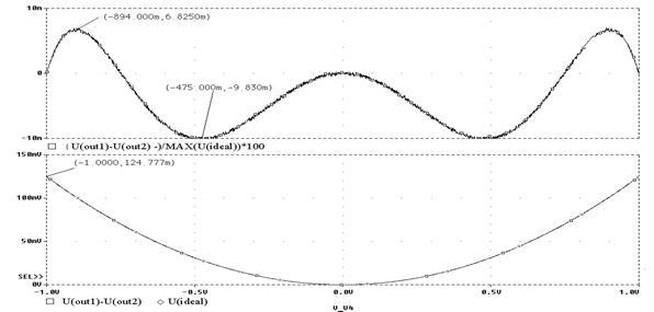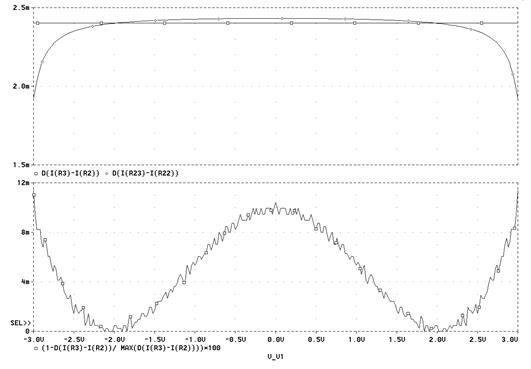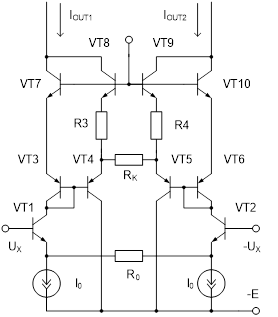 4,5. Отклонение от линейности составляет ± 0,022 %. Столь высокая линейность объясняется полной симметрией схемы и взаимной компенсацией нелинейности преобразования разности напряжений база-эмиттер и напряжения коллектор-база (напряжение коллектор-база транзисторов при питании от ±1,5 В становится отрицательным при UX