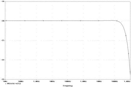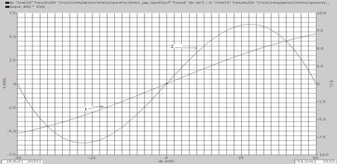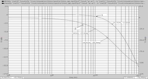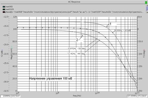 На рисунке 5.9 представлены графики, характеризующие частотные свойства перемножителя. Полоса пропускания перемножителя по уровню –3дБ составляет 25 ГГц (при частоте fT