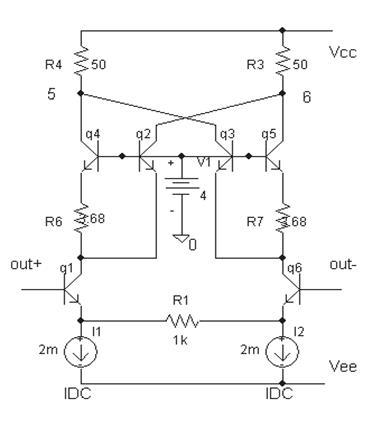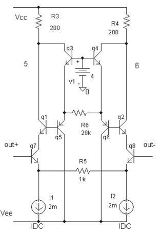 Как уже отмечалось, проблема построения высоколинейного перемножителя для низковольтных питающих напряжений достаточно сложна. Обычно цепи компенсации, повышающие линейность перемножителя, тем или иным способом измеряют ток в преобразователе «напряжение-ток» и формируют компенсирующее воздействие. В этом случае, как правило, требуется последовательное включение в цепи коллекторов дополнительных диодов, что потребует повышения питающих напряжений [6]. На рисунке 2.9 представлена схема балансного смесителя, способная работать при напряжении питания не более 3U