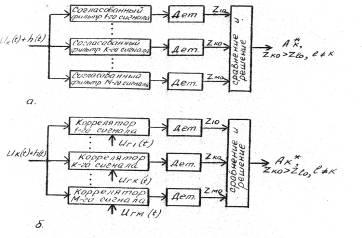 Различение сигналов по времени при фильтровой обработке (рис. 9,а) основано на использовании одного согласованного фильтра, импульсная характеристика которого согласована с законом модуляции сигналов