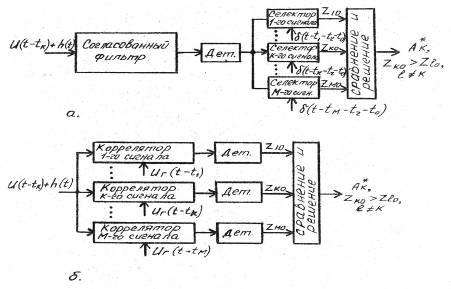 Различение сигналов по времени по корреляционной обработке (рис. 9,б) основано на использовании М