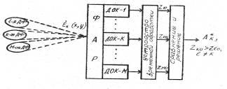 элементам пространства распознавания, устройства распределения комплексных амплитуд принятого сигнала по элементам пространства распознавания (устройства формирования портрета), М каналов устройств оптимальной обработки всех К -х