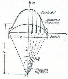 Диаметр раскрыва зеркала является функцией требующейся ширины диаграммы направленности, а также несколько зависит от амплитудной и фазовой характеристики в раскрыве зеркала. Закон распределения амплитуд поля вдоль поверхности раскрыва зеркала определяется диаграммой излучения облучателя, если пренебречь потерями при отражении от зеркала. Для большинства применяющихся облучателей распределение амплитуд в одной из плоскостей (горизонтальной или вертикальной) вдоль раскрыва зеркала можно с достаточной точностью апроксимировать законом (1-x2) p, где х - координата, откладываемая от оси антенны; р = 0,1,2,3 - некоторое целое число.