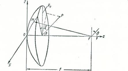Приближенная формула, полученная в работе А.М. Моделя, выведена с учетом распределения токов на поверхности зеркала. Сущность этого способа заключается в следующем: сначала определяется плотность тока на поверхности зеркала, а затем по известному распределению плотности тока на поверхности зеркала рассчитывается поле антенны на большом расстоянии. Получаемые этим методом формулы справедливы в пределах небольших углов излучения и для зеркал малой кривизны . На рисунке 16 представлены обозначения требуемые для расчета диаграммы направленности.