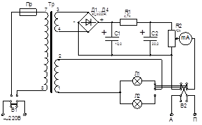 С помощью кнопочного переключателя B2 (кнопка "А±" на панели управления) можно изменять полярность выходных гнезд А и П. Для индикации выбранной полярности переключатель В2 коммутирует также сигнальные лампы Л1, Л2, питающиеся от отдельной обмотки трансформатора. Глазки сигнальных ламп имеют надписи: левая – "А+", правая – "А-" соответственно тому, подключено гнездо А к положительному или отрицательному полюсу выпрямителя.