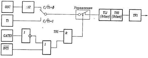 Установка битов М1=0, М0=1 определяет режим работы 1. Режим 1 аналогичен режиму 0. Отличие состоит в том, что установка режима 1 превращает Т/С в устройство на основе 16-разрядного регистра. Для Т/С 0 регистр состоит из программно доступных пар TL0, ТН0, для Т/С 1 из программно доступных пар TL1, ТН1. Логика работы в режиме 1 на примере Т/С 1 показана на рис. 1.