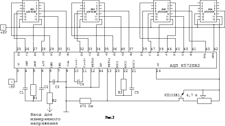 После разрядки интегратора до 0, компаратор снимает сигнал разрешения, и счет прекращается, хотя импульсы со схемы управления продолжают приходить в течении всего такта. В конце такта происходит запись выходного кода со счетчика в выходной регистр. Применительно к микросхеме К572ПВ2 нужно заметить, что на выходе этого регистра имеется дешифратор, который позволяет непосредственно к данной микросхеме подключить 7 сегментные индикаторы типа АЛС324Б и АЛС 324В [5 стр.165] для визуального считывания информации.