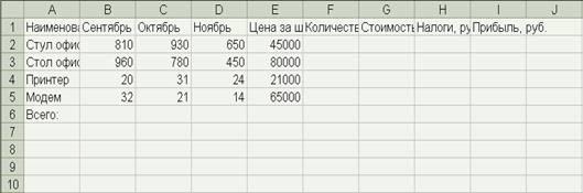 Запускаем MicrosoftExcel. На чистом рабочем листе в диапазон ячеек А1: I1 вводим названия граф, остальные в соответствии с заданием заполняем исходными данными (рис.2.1).