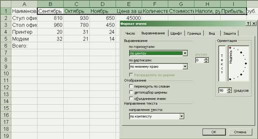 Выполним изменение ориентации текста в ячейках. Для этого выделяем все ячейки, в которых текст должен быть написан вертикально снизу вверх. При этом для выделения ячеек, не составляющих один прямоугольный диапазон, удерживаем нажатой клавишу "Ctrl". Затем выполняем команду "Формат - Ячейки" и в открывшемся диалоговом окне на вкладке "Выравнивание" (рис.2.2) устанавливаем в пункте "Ориентация" значение 90 градусов.
