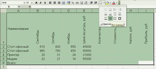 Выполняем обрамление таблицы. Для этого выделяем диапазон А1: I8 и в кнопке-меню "Границы" выбираем пункт "Все границы" (рис.2.3).