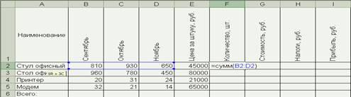 Для расчета количества вводим в ячейку F2 формулу "=СУММ (B2: D2)" (рис.2.4), для расчета стоимости - в ячейку G2 формулу "=E2*F2", для расчета налогов - в ячейку H2 формулу "=ЕСЛИ (G2>100000; G2*30%; G2*10%)", для расчета прибыли - в ячейку I2 - "=G2-H2".