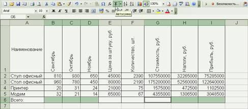Для расчета необходимых сумм в строке "Всего: " (строка 6 рабочего листа) выделяем ячейки B6: D6, G6: I6 и нажимаем кнопку "Автосумма" на Стандартной панели инструментов (рис.2.6).
