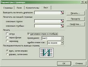В режиме формул принято отображать заголовки столбцов и строк, поэтому выполняем команду "Файл - Параметры страницы" и на вкладке "Лист" устанавливаем соответствующий флажок (рис.2.7). Распечатки таблицы с результатами в обычном виде и в режиме отображения формул приводим в Приложении А.