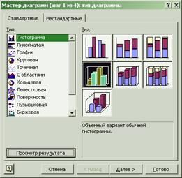Выделяем диапазон I3: I7 м нажимаем кнопку "Мастер диаграмм" на панели инструментов "Стандартная". На первом шаге Мастера диаграмм выбираем тип "Гистограмма" и вид "Объемный вариант обычной диаграммы" (рис.2.8), нажимаем кнопку "Далее".